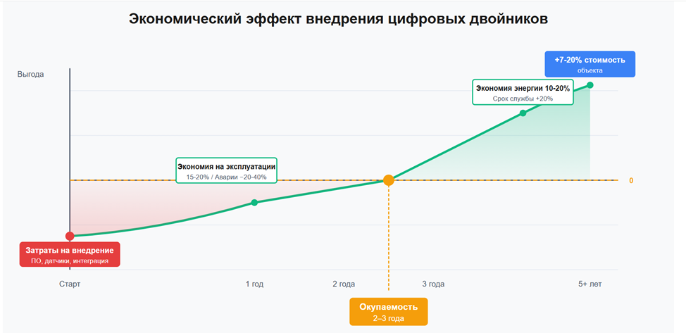 Экономические выгоды внедрения: сокращение эксплуатационных расходов на 15-20%, снижение аварийности на 20-40%, продление срока службы оборудования до 20%. Также снижение энергопотребления на 10-20% и повышение стоимости объекта на 7-20%. Срок окупаемости составляет 2-3 года.