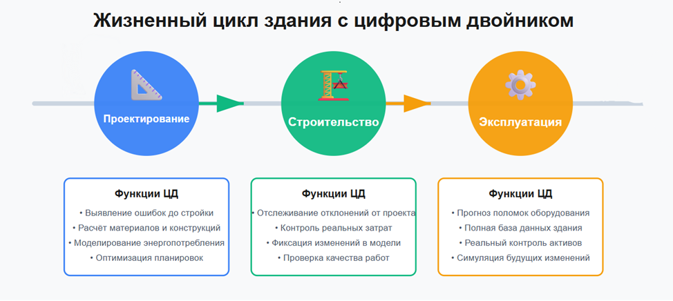 Цифровые двойники работают на всех этапах жизни здания. При проектировании архитекторы моделируют влияние изменений на энергоэффективность и движение людей. Двойник легко находит проектные ошибки до начала стройки, что сокращает затраты на исправления. В процессе строительства двойник, обновляемый данными с лазерных сканеров и дронов, отслеживает соответствие работ проекту и контролирует бюджет в реальном времени.