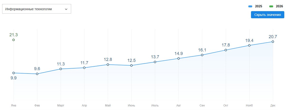 По данным hh.статистика за весь 2025 год hh.индекс (Показывает соотношение количества активных резюме к количеству активных вакансий на рынке в выбранной профобласти)